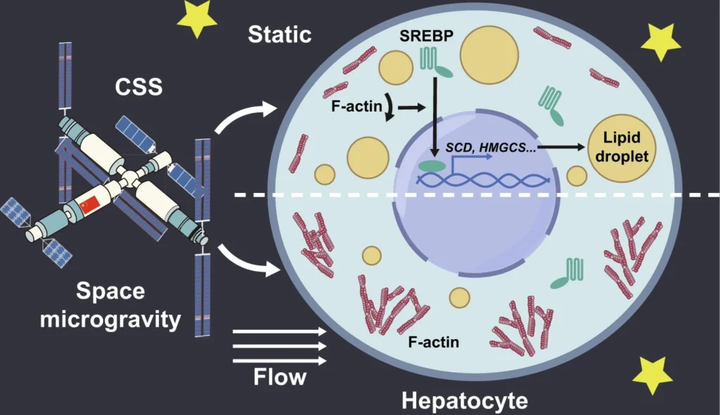 Pour explorer l’impact de la microgravité sur le métabolisme lipidique hépatique, une équipe chinoise a mené une étude comparative sur deux cultures de cellules hépatiques : l’une à bord de la station spatiale Tiangong et l’autre sur Terre. Utilisant un module d’expérimentation biomécanique, les chercheurs ont observé que l’apesanteur stimule la synthèse d’acides gras et de cholestérol via l’activation des protéines SREBPs.