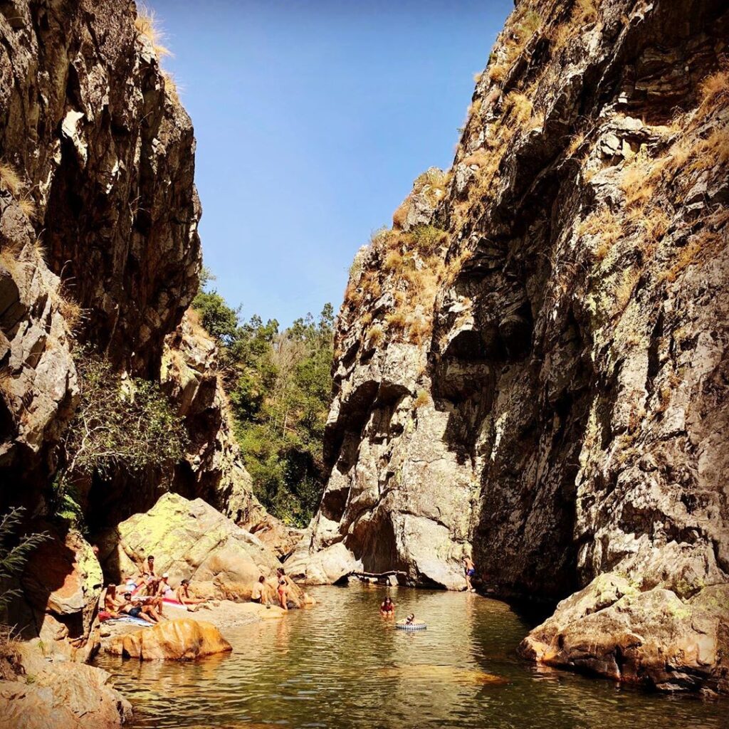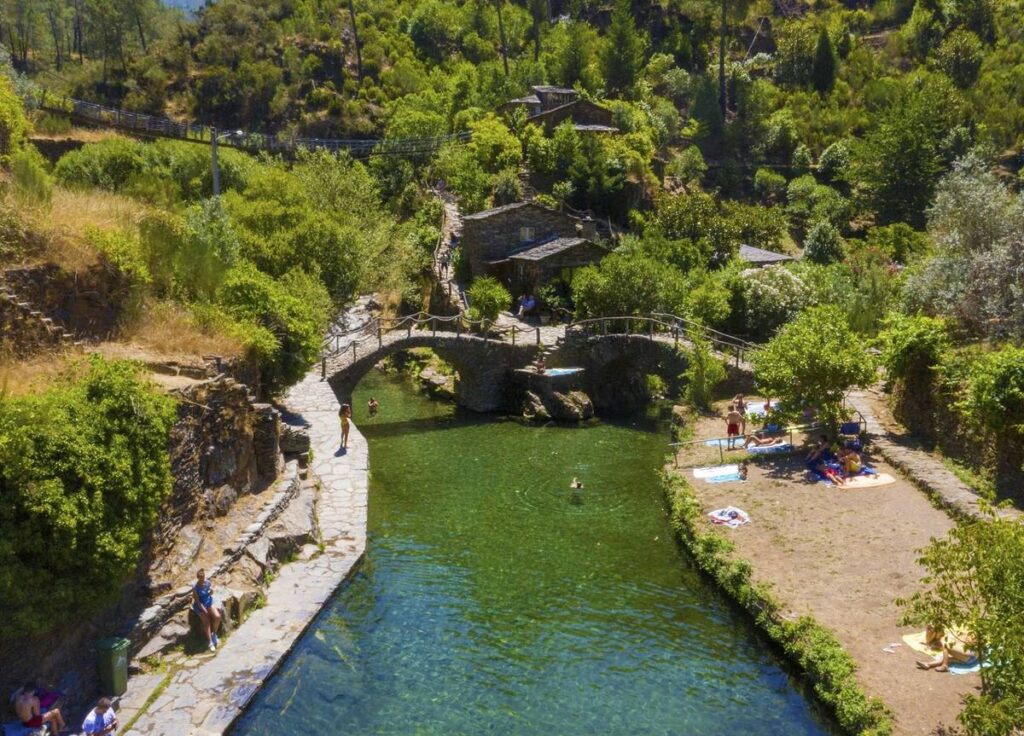 La plage de la rivière Foz d’Égua, située à Arganil, se dévoile au confluent de deux ruisseaux, créant un miroir d’eau d’une beauté rare. Ce lieu bucolique est entouré de moulins traditionnels et de ponts en pierre, offrant un décor pittoresque et authentique.