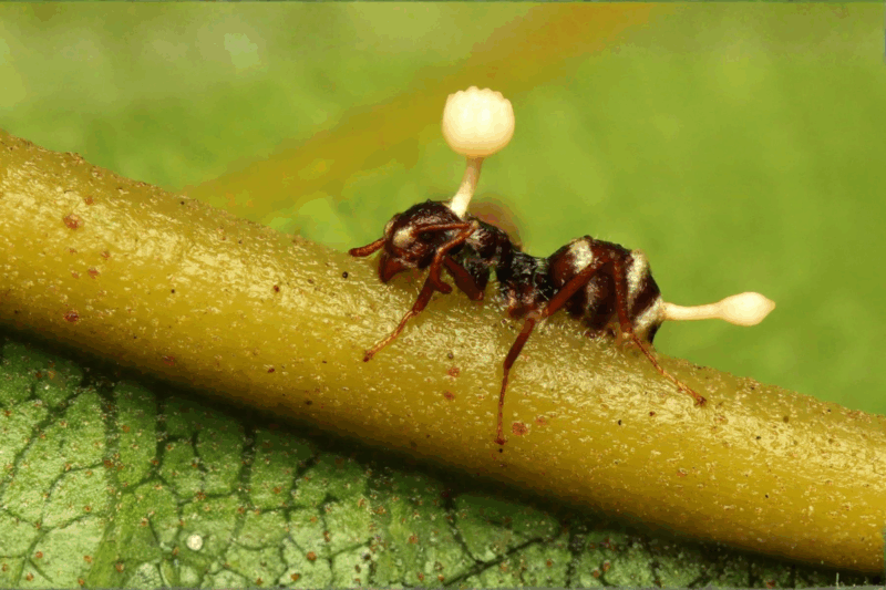 Parmi les exemples les plus frappants de manipulation parasitaire, le champignon Ophiocordyceps transforme littéralement les fourmis en « zombies » : infectées, elles quittent leur colonie, grimpent sur une feuille et s’y fixent avant d’être dévorées de l’intérieur, permettant au parasite de disséminer ses spores.