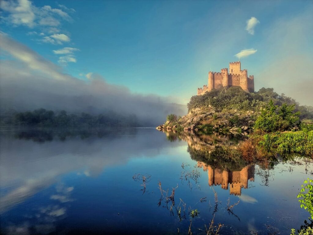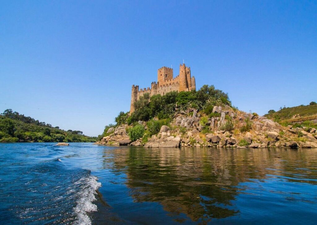 Perché sur une île rocheuse du Tage, le château d’Almourol, construit en 1171, incarne l’héritage médiéval des Templiers au Portugal.