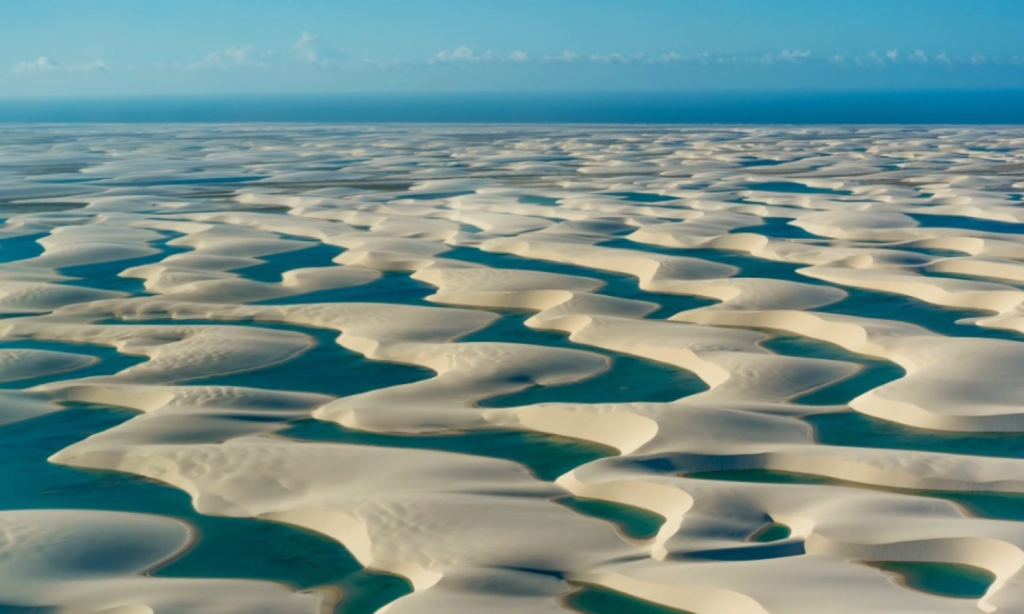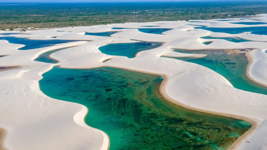 Situé à l’extrême nord-est du Brésil, dans l’État du Maranhão, le Parc national Lençóis Maranhenses s’étend sur 1500 km² de dunes blanches spectaculaires. Ce paysage unique est parsemé de lagunes aux eaux turquoise et vert émeraude, créant un contraste saisissant avec le sable immaculé.