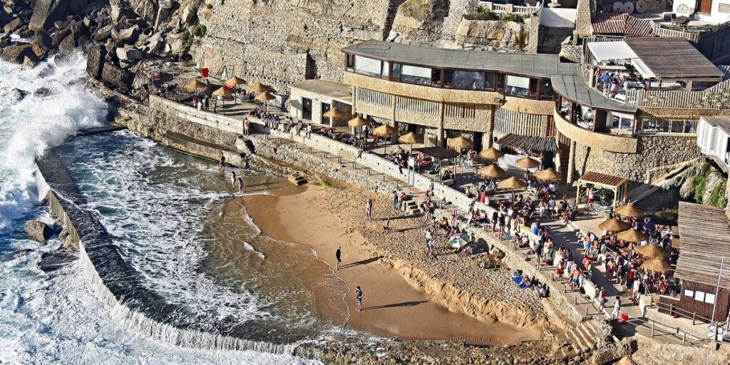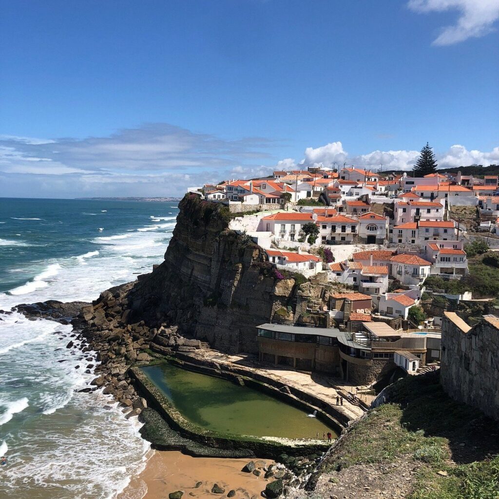En contrebas, la Praia d’Azenhas do Mar se dévoile, nichée entre les falaises. Cette plage secrète abrite une piscine naturelle d’eau de mer, idéale pour une baignade paisible, à l’abri des vagues.