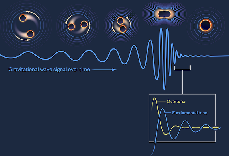 Lorsqu’une collision de trous noirs se produit, le trou noir résultant émet des “tons” similaires à ceux d’une cloche. Chaque “ton” est défini par sa fréquence et sa décroissance. En mesurant deux tons distincts, on obtient deux évaluations indépendantes des propriétés du trou noir, telles que sa masse et son spin.